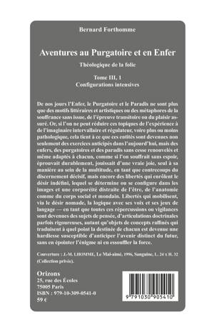 De nos jours l'Enfer, le Purgatoire et le Paradis ne sont plus que des motifs littéraires et artistiques ou des métaphores de la souffrance sans issue, de l'épreuve transitoire ou du plaisir assuré. Or, si l'on ne peut réduire ces topiques de l'expérience à de l'imaginaire intervallaire et régulateur, voire plus ou moins pathologique, cela tient à ce que ces entités sont devenues non seulement des exercices anticipés dans l'aujourd'hui, mais des enfers, des purgatoires et des paradis sans cesse renouvelés et même adaptés à chacun, comme si l'on souffrait sans espoir, éprouvait durablement, jouissait d'une vraie joie, seul à sa manière au sein de la multitude, en tant que contrecoups du discernement décisif, mais encore des libertés qui enrôlent le désir indéfini, lequel se détermine ou se configure dans les images et une corporéité distraite de l'être, de l'anatomie comme du corps social et mondain. Libertés qui mobilisent, via le désir nomade, la logique avec ses voix et ses jeux de langage - en tant que toutes ces répercussions ou vigilances sont devenues des sujets de pensée, d'articulations doctrinales parfois rigoureuses, autant qu'objets de concepts raffinés qui traduisent à quel point la destinée de chacun est devenue une hardiesse susceptible d'anticiper l'avenir distinct du futur, sans en épointer l'énigme ni en essouffler la force.