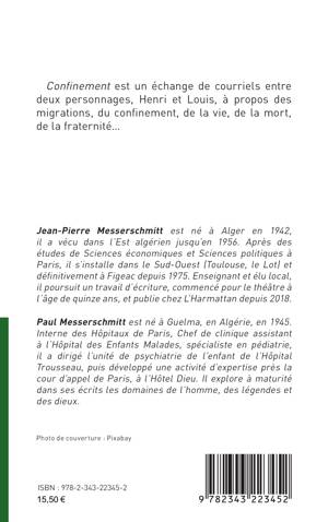Confinement est un échange de courriels entre deux personnages, Henri et Louis, à propos des migrations, du confinement, de la vie, de la mort, de la fraternité...