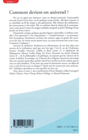 L'humanité compte quelques grandes figures universelles. Combien sont-elles ? Elles vivent encore parmi nous, car nous revenons sans cesse à elles. Comment l'expliquer ? Anciens ou modernes, fondateurs ou réformateurs, ces "grands hommes" ont leur place aux sources de la civilisation quel que soit leur âge. C'est le cas de Confucius, Socrate, Gandhi, Avicenne, Galilée et Bach (tome 1) et également de Shakespeare, Mozart, Luther King, De Vinci, Descartes et Einstein (tome 2). D'où vient que nous les honorions encore, en dépit de tout ce qui devrait nous en éloigner ? Quels sont les ressorts de cette universalité ?
