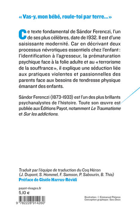 "Vas-y, mon bébé, roule-toi par terre..." (Ferenczi) Ce texte fondamental de Sandor Ferenczi, l'un de ses plus célèbres, date de 1932. Il est d'une saisissante modernité. Car en décrivant deux processus névrotiques essentiels chez l'enfant : l'identification à l'agresseur, la prématuration psychique face à la folie adulte et au "terrorisme de la souffrance", il explique une séduction liée aux pratiques violentes et passionnelles des parents face aux besoins de tendresse physique émanant des enfants.