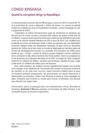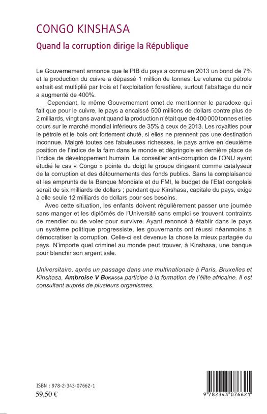 Cet ouvrage aborde en premier lieu l'argent sale, en le définissant et en passant en revue son historique au Congo. Il traite ensuite de l'acceptation du fait de "l'argent mal acquis" par la société congolaise, ce qui, pour beaucoup d'observateurs neutres, constitue le nœud du blocage sociétal. Pour finir, l'auteur explique pourquoi la situation est dramatique pour le pays et pourquoi les guerres civiles ne finissent pas après l'adoption de la corruption comme moteur des relations sociales par la société congolaise.