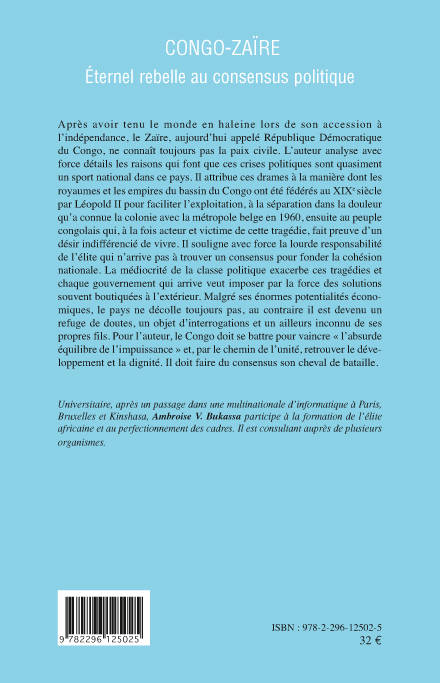 Après avoir tenu le monde en haleine lors de son accession à l'indépendance, le Zaïre, aujourd'hui appelé République Démocratique du Congo, ne connaît toujours pas la paix civile. L'auteur analyse avec force détails les raisons qui font que ces crises politiques sont quasiment un sport national dans ce pays. Pour l'auteur, le Congo doit se battre pour vaincre "l'absurde équilibre de l'impuissance" et, par le chemin de l'unité, retrouver le développement et la dignité. Il doit faire du consensus son cheval de bataille.
