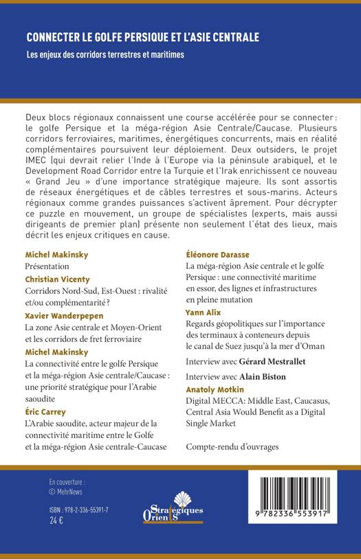 Deux blocs régionaux connaissent une course accélérée pour se connecter le golfe Persique et la méga-région Asie Centrale/Caucase. Plusieurs corridors ferroviaires, maritimes, énergétiques concurrents, mais en réalité complémentaires poursuivent leur déploiement. Deux outsiders, le projet IMEC (qui devrait relier l'Inde à l'Europe via la péninsule arabique), et le Development Road Corridor entre la Turquie et l'Irak enrichissent ce nouveau Grand Jeu d'une importance stratégique majeure. Ils sont assortis de réseaux énergétiques et de câbles terrestres et sous-marins. Acteurs régionaux comme grandes puissances s'activent âprement. Pour décrypter ce puzzle en mouvement, un groupe de spécialistes (experts, mais aussi dirigeants de premier plan) présente non seulement l'état des lieux, mais décrit les enjeux critiques en cause.