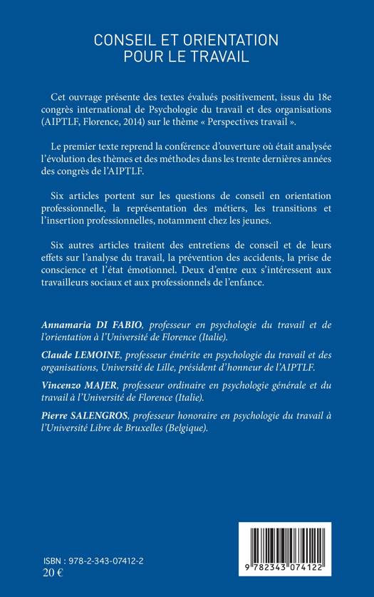 Cet ouvrage présente des textes issus du 18e congrès international de Psychologie du travail et des organisations sur le thème « Perspectives travail ». Six articles portent sur les questions de conseil en orientation professionnelle et de représentation des métiers, sur les transitions et l'insertion professionnelle. Six autres articles traitent des entretiens de conseil et de leurs effets sur l'analyse du travail, la prévention des accidents, la prise de conscience et l'état émotionnel.