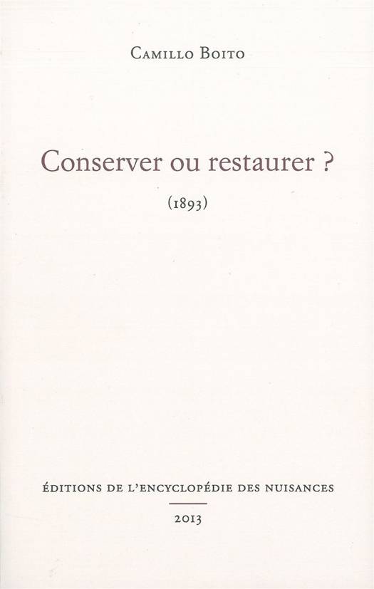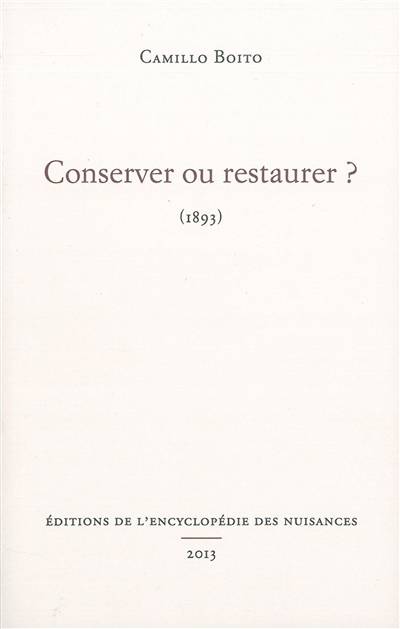 Recueil de quatre essais publiés en 1893 par l'architecte, ingénieur et historien de l'art C. Boito (1836-1914). Sous la forme de dialogues, ils invitent à la prudence en matière de restauration des édifices anciens et des oeuvres d'art.