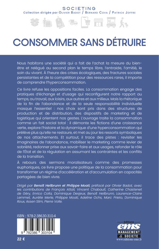 Ce livre refuse les oppositions faciles. La consommation engage des pratiques d’échange et d’usage qui reconfigurent notre rapport au temps, au travail, aux loisirs, aux autres et aux milieux. Mais la rhétorique de la fin de l’abondance et de la seule responsabilité individuelle masque l’essentiel : nos choix sont pris dans des structures de production et de distribution, des dispositifs de marketing et de logistique qui orientent nos gestes. L’ouvrage traite la consommation comme un fait social total : il démonte les fictions d’une croissance verte, explore l’histoire et la dynamique d’une hyperconsommation qui prélève plus qu’elle ne restaure, et met au jour les ressorts symboliques de nos attachements. Et surtout, il trace des pistes : revisiter les imaginaires de l’abondance, mobiliser le marketing comme levier de sobriété, redonner prise aux savoir-faire et aux usages, refonder le rôle de l’État et de la régulation en assumant les contraintes et les conflits de la transition.