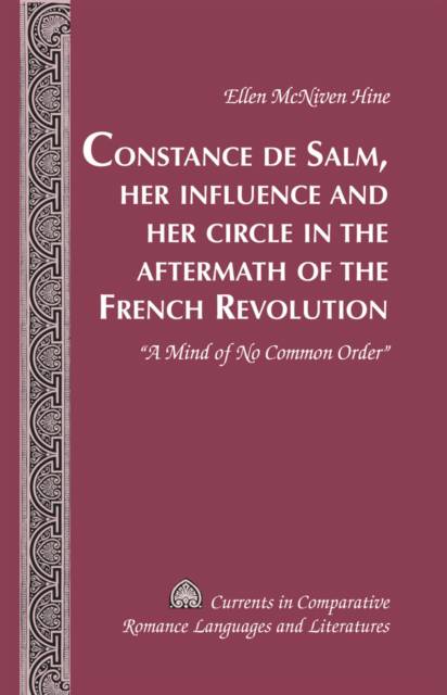 Largely forgotten during the second half of the nineteenth century and throughout most of the twentieth century, Constance de Salm (Constance-Marie de Théis, Mme Pipelet de Leury, later Princess de Salm-Reifferscheid-Dyck, ) finally attracted the attention of such scholars as Elizabeth Colwill, Geneviève Fraisse, Huguette Krief, and Christine Planté in the early twenty-first century. However, there has to date been no comprehensive study of her published works, her vast correspondence, and the importance of her cultural exchanges. In this book, Ellen McNiven Hine contributes to the recent upsurge of interest in the literature of this particularly turbulent period in French history. This book considers not only her literary aspirations and claim to fame but also such topics as her contribution to the scientific culture of the period, the extent of the political involvement of a non-activist woman, her challenge to what she saw as inequitable provisions in the Civil Code, her championing of women's progress in literature and the arts, and the role that networking and patronage played in her personal and professional life. Moreover, the study highlights the similarities and differences between her life, writing, and influence and those of other postrevolutionary women such as Mary Wollstonecraft, Germaine de Staël, Margaret Somerville, and Louise Colet. Constance de Salm uses a variety of genres to address issues of particular importance to women, such as equal access to educational opportunities, the cost to women's health of reproduction, and lack of economic resources for single and widowed women. She displays a surprising modernity in her awareness of the difficulty of resolving relationship, career, and motherhood problems that continue to plague women in the twenty-first century and points to a future in which women will have access to educational and employment opportunities.