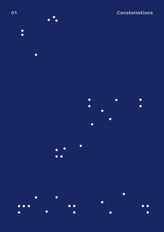 Les carnets à jouer forment une collection de carnets de notes, de dessins et de jeux graphiques. À travers des propositions simples (points à relier, grilles à colorier, etc.), ils abordent des thématiques propres au design graphique, dans la lignée du Cahier d’exploration graphique dont ils constituent des prolongements directs : de l’exercice unique, onxpasse à la série, à la variation. Ces carnets permettent d’explorer les jeux plus en profondeur, d’essayer, tester, rater pour mieux recommencer. Constellations aborde la question du dessin decaractère, en reprenant un principe de jeu canonique : « les points à relier ». Au fil des pages, ils’agit de relier pour lire. Point à point, lettre à lettre, page à page, se dessine une phrase cachée dans ces constellations typographiques. Ces dernières ont été réalisées à partir des points d’ancrage exacts utilisés par les dessinateurs des différents caractères utilisés. Par ce simple « jeu d’enfant », l’anatomie et la genèse de ces créations typographiques sont ainsi rendues visibles.