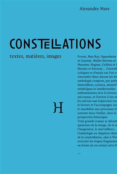 Proust, Man Ray, Oppenheim et Crevel. Bataille, Rivière, Oates et Guyotat. Mallet-Stevens et Breuer. Schulz et von Stroheim. Mansour, Hugnet, Caillois et Duprat. Pynchon, Exley, Robbins, Huncke et Kerouac… Constellations rassemble un choix de textes critiques et d’essais sur l’art et la littérature écrits et publiés par Alexandre Mare durant les dix dernières années. Cette riche anthologie compose, par petites touches, le portrait d’un auteur bienveillant, curieux, attentif à une multitude de matières esthétiques et intellectuelles. Un auteur désirant partager ses enthousiasmes avec le lecteur, lui faire découvrir des créateurs méconnus, et l’inviter à lire et à regarder autrement. Par l’oblique. En suivant une trajectoire transversale. Alexandre Mare accueille le lecteur et l’accompagne sur des chemins encore à défricher ; le sensibilise aux processus d’élaboration de l’œuvre. L’installe souvent dans l’atelier, dans la fabrique, tout en projetant une perspective historique.