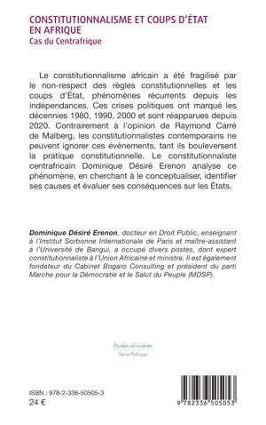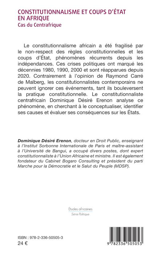 Le constitutionnalisme africain a été fragilisé par le non-respect des règles constitutionnelles et les coups d'État, phénomènes récurrents depuis les indépendances. Ces crises politiques ont marqué les décennies 1980, 1990, 2000 et sont réapparues depuis 2020. Contrairement à l'opinion de Raymond Carré de Malberg, les constitutionnalistes contemporains ne peuvent ignorer ces événements, tant ils bouleversent la pratique constitutionnelle. Le constitutionnaliste centrafricain Dominique Désiré Erenon analyse ce phénomène, en cherchant à le conceptualiser, identifier ses causes et évaluer ses conséquences sur les États.