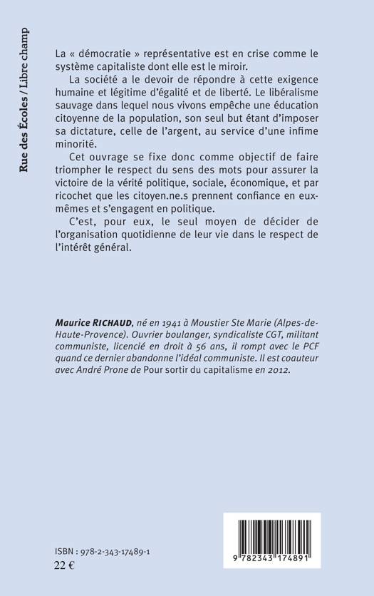 La « démocratie » représentative est en crise comme le système capitaliste dont elle est le miroir. La société a le devoir de répondre à cette exigence humaine et légitime d'égalité et de liberté. Le libéralisme sauvage dans lequel nous vivons empêche une éducation citoyenne de la population, son seul but étant d'imposer la dictature de l'argent au service d'une infime minorité. Cet ouvrage se fixe donc comme objectif de faire triompher le respect du sens des mots pour assurer la victoire de la vérité politique, sociale, économique, et par ricochet que les citoyen.ne.s prennent confiance en eux-mêmes et s'engagent en politique. C'est leur seul moyen de décider de l'organisation quotidienne de leur vie dans le respect de l'intérêt général.