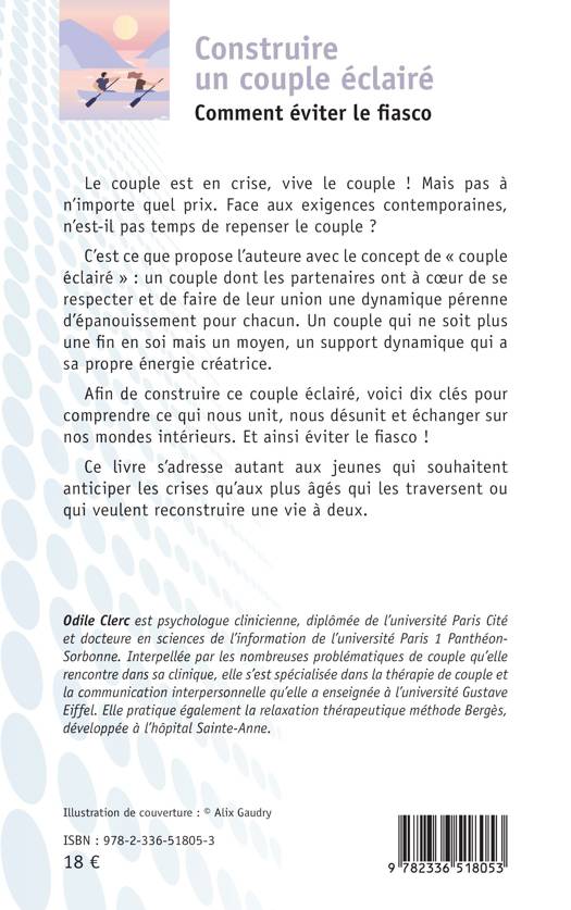Le couple est en crise, vive le couple ! Mais pas à n'importe quel prix. Face aux exigences contemporaines, n'est-il pas temps de repenser le couple ? C'est ce que propose l'auteure avec le concept de couple éclairé: un couple dont les partenaires ont à coeur de se respecter et de faire de leur union une dynamique pérenne d'épanouissement pour chacun. Un couple qui ne soit plus une fin en soi mais un moyen, un support dynamique qui a sa propre énergie créatrice. Afin de construire ce couple éclairé, voici dix clés pour comprendre ce qui nous unit, nous désunit et échanger sur nos mondes intérieurs. Et ainsi éviter le fiasco ! Ce livre s'adresse autant aux jeunes qui souhaitent anticiper les crises qu'aux plus âgés qui les traversent ou qui veulent reconstruire une vie à deux.
