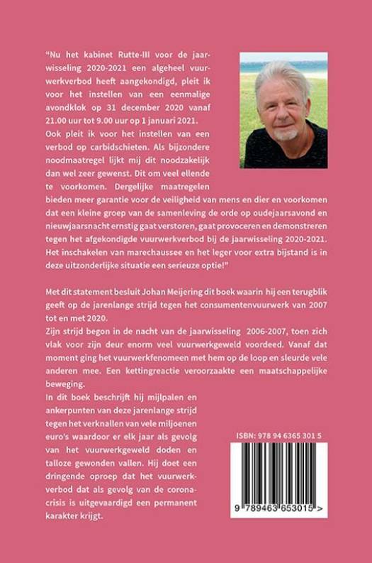 Met dit statement besluit Johan Meijering dit boek waarin hij een terugblik geeft op de jarenlange strijd tegen het consumentenvuurwerk vanaf 2007 tot en met 2020. Zijn strijd begon in de nacht van de jaarwisseling 2006-2007, toen zich vlak voor zijn deur enorm veel vuurwerkgeweld voordeed. Vanaf dat moment ging het vuurwerkfenomeen met hem op de loop en sleurde vele anderen mee. Een kettingreactie veroorzaakte een maatschappelijke beweging. In dit boek beschrijft hij mijlpalen en ankerpunten van deze jarenlange strijd tegen het verknallen van vele miljoenen euro’s waardoor er elk jaar als gevolg van het vuurwerkgeweld doden en talloze gewonden vallen. Hij doet een dringende oproep dat het vuurwerkverbod dat als gevolg van de coronacrisis is uitgevaardigd een permanent karakter krijgt.