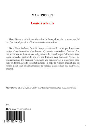 Marc Pierret a publié une douzaine de livres, dont cinq romans qui lui ont fait une réputation d'écrivain résolument mineur. Dans Conte à rebours, l'autofiction promotionnelle prisée par les économistes d'une littérature d'ambiance, s'y trouve contredite. L'auteur n'est pas arc-bouté au Bien et aux indignations de bon aloi que l'idéalisme, toujours stipendié, gratifie de ses faveurs. Il révèle avec bravoure l'envers de ses narrations. Un humour réfractaire à la caricature et à la dérision soutient le démontage de ses affabulations il sape la religion médiatique du roman pour tous et fait apparaître la véracité d'un roman qui s'adresse à chacun. Avec une postface de Guillaume Basquin.