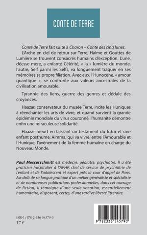 Conte de Terre fait suite à Charon - Conte des cinq lunes. L'Arche en ciel de retour sur Terre, Haime et Gouttes de Lumière se trouvent consacrés humains d'exception. L'une, déesse mère, a enfanté Célérité, la lumière du monde, l'autre, Self parmi les Selfs, va longuement traquer en ses mémoires sa propre filiation. Avec eux, l'Hunocène, amour quantique, se confronte aux valeurs ancestrales de la civilisation amourable. Tyrannie des liens, guerre des genres et dédale des croyances. Haazar, conservateur du musée Terre, incite les Huniques à réenchanter les arts de vivre, et quand survient la grande épidémie mondiale du virus couronné, l'humanité démontre enfin une miraculeuse solidarité. Haazar meurt en laissant un testament du futur et une enfant posthume, Aimma, qui va vivre, entre l'Amourable et l'Hunique, l'avènement de la femme humaine en charge du Nouveau Monde.