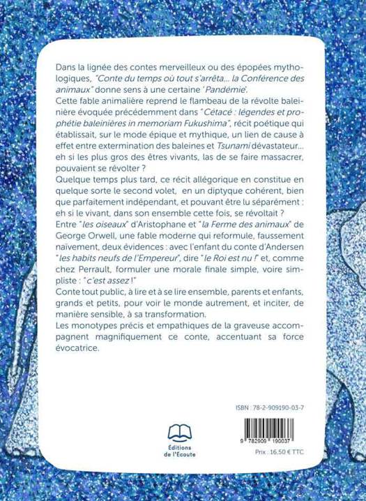 Dans la lignée des contes merveilleux ou des épopées mythologiques, “Conte du temps où tout s’arrêta… la Conférence des animaux” donne sens à une certaine ‘Pandémie’. Cette fable animalière reprend le flambeau de la révolte baleinière évoquée précédemment dans “Cétacé : légendes et prophétie baleinières in memoriam Fukushima”, récit poétique qui établissait, sur le mode épique et mythique, un lien de cause à effet entre extermination des baleines et Tsunami dévastateur… eh si les plus gros des êtres vivants, las de se faire massacrer, pouvaient se révolter ? Quelque temps plus tard, ce récit allégorique en constitue en quelque sorte le second volet, en un diptyque cohérent, bien que parfaitement indépendant, et pouvant être lu séparément : eh si le vivant, dans son ensemble cette fois, se révoltait ? Entre “les oiseaux” d’Aristophane et “la Ferme des animaux” de George Orwell, une fable moderne qui reformule, faussement naïvement, deux évidences : avec l’enfant du conte d’Andersen “les habits neufs de l’Empereur”, dire “le Roi est nu !” et, comme chez Perrault, formuler une morale finale simple, voire simpliste : “c’est assez !” Conte tout public, à lire et à se lire ensemble, parents et enfants, grands et petits, pour voir le monde autrement, et inciter, de manière sensible, à sa transformation. Les monotypes précis et empathiques de la graveuse accompagnent magnifiquement ce conte, accentuant sa force évocatrice.