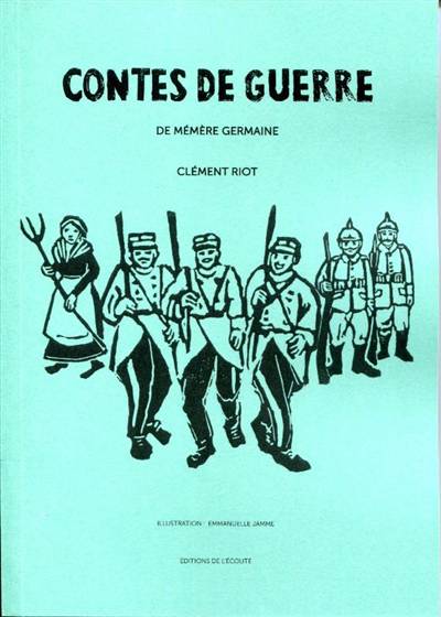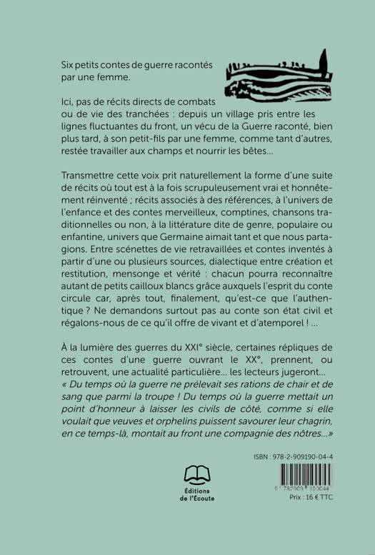 Six petits contes de guerre Les yeux d’une femme lucide, la voix d’une femme enjouée, le cœur d’une grand-mère qui raconte pour un, pour tous les enfants… et les adultes La découverte d’une carte postale adressée par Mémère Germaine, à mon grand-père Georges, fut l’étincelle qui réveilla des souvenirs enfouis : une relation privilégiée à ma grand-mère, ses récits de vie, contes ou petites histoires, anecdotes familiales et d’époque, autant de pépites prennent leur véritable valeur bien plus tard, avec la conscience du temps et de la vie. Ici, pas de collectage, de folklore, de leçon d’Histoire, seulement ce qu’il me fallait essayer de transmettre : émotion, pulsion de vie, présence, atmosphère et épaisseur humaines. Germaine étant une femme, pas non plus de récits de combats ni de vie des tranchées, mais, depuis un village en zone de combat, rien qu’un vécu de la Grande Guerre, comme on la nommera longtemps. Une femme comme tant d’autres, restée travailler aux champs et nourrir les bêtes… Cette voix à transmettre prit naturellement la forme de récits où tout est à la fois scrupuleusement vrai et honnêtement réinventé, associé à des références, citations et renvois à l’univers de l’enfance et des contes merveilleux, comptines, chanson populaire traditionnelle ou non, la littérature dite de genre, populaire ou enfantine, univers que Germaine aimait tant et que nous partagions. Entre récits de vie retravaillés et contes inventés à partir d’une ou plusieurs sources, dialectique entre création et restitution, mensonge et vérité : chacun pourra reconnaître autant de petits cailloux blancs grâce auxquels l’esprit du conte circule car, après tout, finalement, qu’est-ce que l’authentique ? Ne demandons surtout pas au conte son état civil et régalons-nous de ce qu’il offre de vivant et d’atemporel ! … À la lumière des guerres du XXI° siècle, certaines situations et répliques de ces contes de la guerre ouvrant le XX°, retrouvent une actualité particulière… les lecteurs jugeront… « Du temps où la guerre ne prélevait ses rations de chair et de sang que parmi la troupe ! Du temps où la guerre mettait un point d’honneur à laisser les civils de côté, comme si elle voulait que veuves et orphelins puissent savourer leur chagrin, en ce temps-là, montait au front une compagnie des nôtres… »