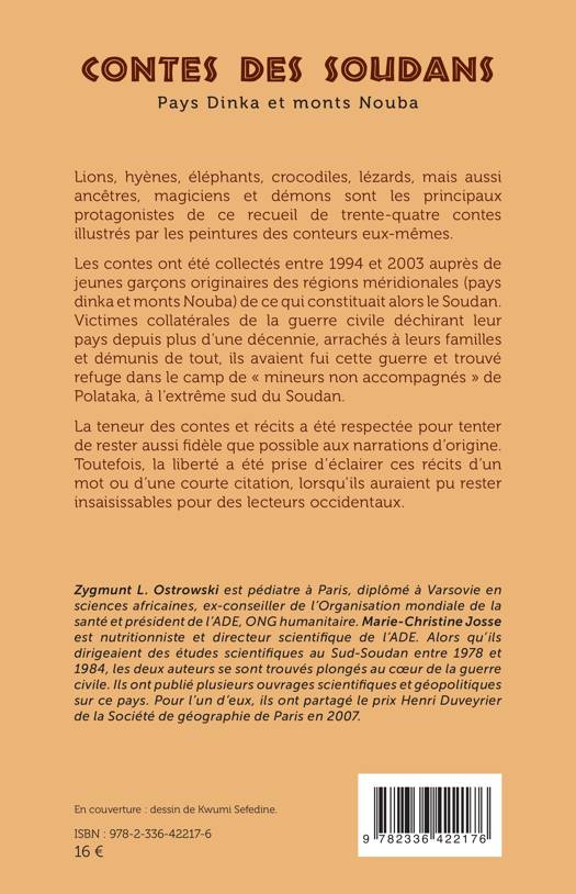 Lions, hyènes, éléphants, crocodiles, lézards, mais aussi ancêtres, magiciens et démons sont les principaux protagonistes de ce recueil de trente-quatre contes illustrés par les peintures des conteurs eux-mêmes. Les contes ont été collectés entre 1994 et 2003 auprès de jeunes garçons originaires des régions méridionales (pays dinka et monts Nouba) de ce qui constituait alors le Soudan. Victimes collatérales de la guerre civile déchirant leur pays depuis plus d'une décennie, arrachés à leurs familles et démunis de tout, ils avaient fui cette guerre et trouvé refuge dans le camp de mineurs non accompagnés de Polataka, à l'extrême sud du Soudan. La teneur des contes et récits a été respectée pour tenter de rester aussi fidèle que possible aux narrations d'origine. Toutefois, la liberté a été prise d'éclairer ces récits d'un mot ou d'une courte citation, lorsqu'ils auraient pu rester insaisissables pour des lecteurs occidentaux.