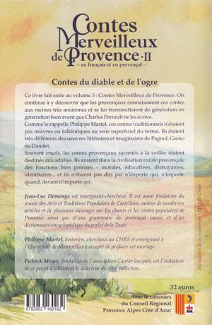 On découvrira dans ces Contes Merveilleux de Provence (Tomes 1 et 2) que le peuple de Provence connaissaient l'histoire du Petit Chaperon Rouge (Lou Capeiroun Rouge), ou de Cendrillon (La Gato Cendrouletto) bien avant que Charles Perrault ne les écrive ou que Walt Disney n'en fasse des films. Ces contes merveilleux se transmettaient oralement, de bouche à oreille, depuis la nuit des temps. Ils prenaient en Provence des formes particulières et se disaient en provençal ou en français (la tradition des chants comme des contes étant bilingue). Ici la plupart des textes sont en provençal. Ils sont fidèlement traduits en français. C'est un travail qui par son contenu et son ampleur est inédit et unique en Provence : comme le soulignent l'ethnomusicologue Jean-Noël Pelen, et l'historien Philippe Martel, dans ce domaine - les contes merveilleux - qui est l'un des plus effacé de la tradition orale, Jean Luc Domenge s'appuie d'abord sur ses propres enquêtes de terrain menées de 1985 à 2015 auprès des gens du pays, des vallées provençales des Alpes Italiennes à la vallée du Rhône, enquêtes de vive voix et avec beaucoup de soin. La préface présente l'ensemble de ces témoins. L'oralité est restituée avec rigueur et resituée dans son contexte. Ces témoignages sont ensuite croisés avec tout ce qui a été publié en provençal depuis la fin du XIXe siècle : livres, revues, almanachs, documents souvent confidentiels ou oubliés, manuscrits inédits retrouvés ici ou là, dont Jean Luc Domenge a fait un long et minutieux travail de classement et de traduction. Place donc au Petit Poucet, à Blanche Neige et au Chat Botté, dans des versions qui vont surprendre plus d'un lecteur.