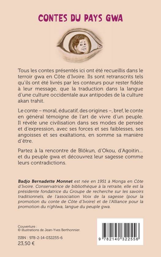 Tous les contes présentés ici ont été recueillis dans le terroir gwa en Côte d'Ivoire. Ils sont retranscrits tels qu'ils ont été livrés par les conteurs pour rester fidèle à leur message, que la traduction dans la langue d'une culture occidentale aux antipodes de la culture akan trahit. Le conte - moral, éducatif, des origines -, bref, le conte en général témoigne de l'art de vivre d'un peuple. Il révèle une civilisation dans ses modes de pensée et d'expression, avec ses forces et ses faiblesses, ses angoisses et ses exaltations, en somme sa manière d'être. Partez à la rencontre de Blôkun, d'Okou, d'Agoitin... et du peuple gwa et découvrez leur sagesse comme leurs contradictions.
