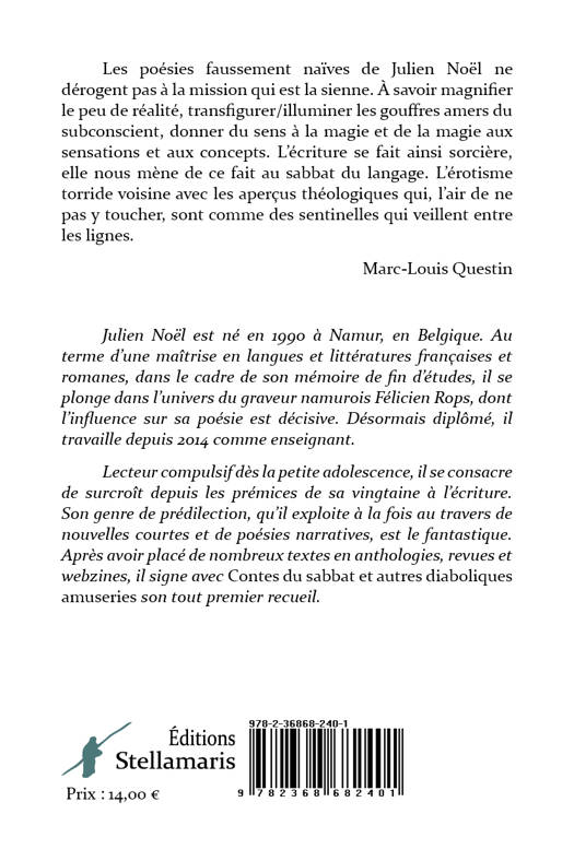 Les poésies faussement naïves de Julien Noël ne dérogent pas à la mission qui est la sienne. À savoir magnifier le peu de réalité, transfigurer/illuminer les gouffres amers du subconscient, donner du sens à la magie et de la magie aux sensations et aux concepts. L’écriture se fait ainsi sorcière, elle nous mène de ce fait au sabbat du langage. L’érotisme torride voisine avec les aperçus théologiques qui, l’air de ne pas y toucher, sont comme des sentinelles qui veillent entre les lignes. Marc-Louis Questin