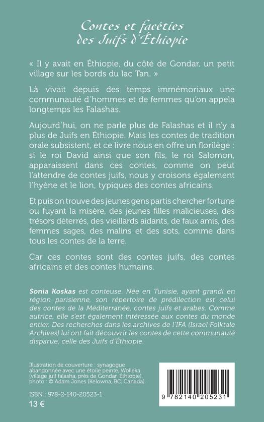 « Il y avait en Éthiopie, du côté de Gondar, un petit village sur les bords du lac Tan. » Là vivait depuis des temps immémoriaux une communauté d’hommes et de femmes qu’on appela longtemps les Falashas. Aujourd’hui, on ne parle plus de Falashas et il n’y a plus de Juifs en Éthiopie. Mais les contes de tradition orale subsistent, et ce livre nous en offre un florilège : si le roi David ainsi que son fils, le roi Salomon, apparaissent dans ces contes, nous y croisons également l’hyène et le lion, typiques des contes africains .Et puis on trouve des jeunes gens partis chercher fortune ou fuyant la misère, des jeunes filles malicieuses, des trésors déterrés, des vieillards aidants, de faux amis, des femmes sages, des malins et des sots. Car ces contes sont des contes juifs, des contes africains et des contes humains.