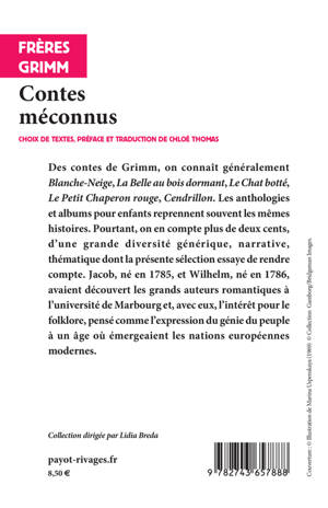 Des contes de Grimm, on connaît généralement "Blanche-Neige", "La Belle au bois dormant", "Le Chat botté", "Le Petit Chaperon rouge", "Cendrillon". Les anthologies et albums pour enfants reprennent souvent les mêmes histoires. Pourtant, on en compte plus de deux cents, d'une grande diversité générique, narrative, thématique dont la présente sélection essaye de rendre compte. Jacob, né en 1785, et Wilhelm, né en 1786, avaient découvert les grands auteurs romantiques à l'université de Marbourg et, avec eux, l'intérêt pour le folklore, pensé comme l'expression du génie du peuple à un âge où émergeaient les nations européennes modernes.