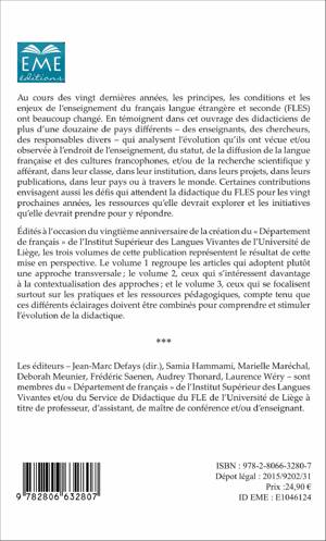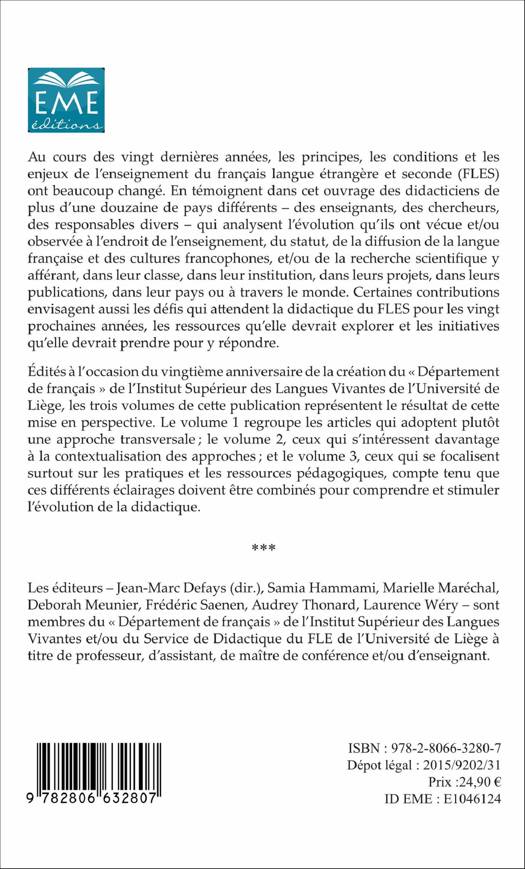 Au cours des vingt dernières années, les principes, conditions et enjeux de l'enseignement du français langue étrangère et seconde (FLES) ont beaucoup changé. En témoignent les didacticiens d'une douzaine de pays qui analysent l'évolution qu'ils ont vécue et/ou observée à l'endroit de l'enseignement, du statut, de la diffusion de la langue française et des cultures francophones, et/ou de la recherche scientifique. Le volume 2 s'intéresse à la contextualisation des approches.