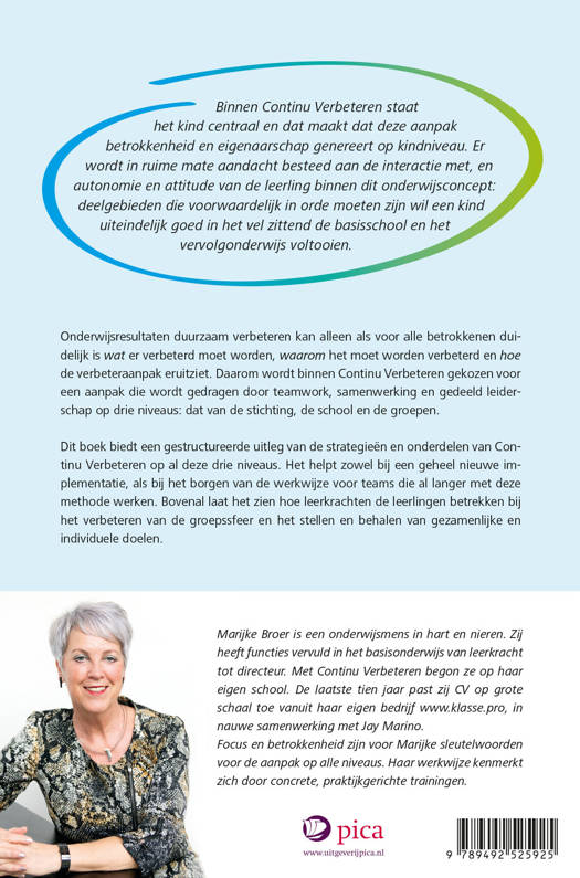 Dit boek biedt een gestructureerde uitleg van de strategieën en onderdelen van Continu Verbeteren op al deze drie niveaus. Het helpt zowel bij een geheel nieuwe implementatie, als bij het borgen van de werkwijze voor teams die al langer met deze methode werken. Bovenal laat het zien hoe leerkrachten de leerlingen betrekken bij het verbeteren van de groepssfeer en het stellen en behalen van gezamenlijke en individuele doelen.