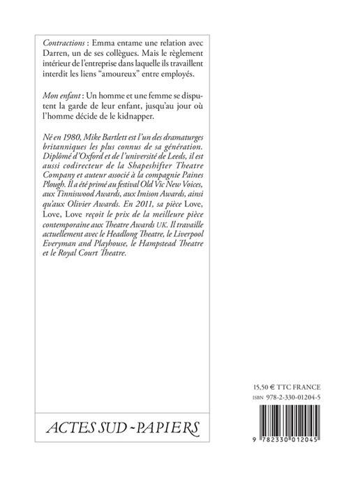 «Né en 1980, Mike Bartlett est l'un des dramaturges britanniques les plus connus de sa génération. Diplômé d'Oxford et de le l'université de Leeds, il est aussi codirecteur de la Shapeshifter Theatre Company et auteur associé à la compagnie Paines Plough. Il a été primé au festival Old Vic New Voices, aux Tinniswood Awards, aux Imison Awards, ainsi qu'aux Olivier Awards. En 2011, sa pièce »Love, love, love« reçoit le prix de la meilleure pièce contemporaine aux Theatre Awards UK. Il travaille actuellement avec le Headlong Theatre, le Liverpool Everyman and Playhouse, le Hampstead Theatre et le Royal Court Theatre.»