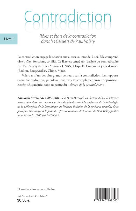 La contradiction engage la relation aux autres, au monde, à soi. Elle comprend divers rôles, fonctions, conflits. Cet ouvrage est centré sur l’analyse du contradictoire par Paul Valéry dans les Cahiers, à laquelle se joignent d’autres analyses (Badiou, Fougeyrollas, Chine, Mao). Valéry est l’un des plus grands penseurs sur la contradiction. Les rapports entre contradiction, paradoxe, contrariété, complémentarité, opposition, extrémité et symétrie sont au centre du « démon de la contradiction ».