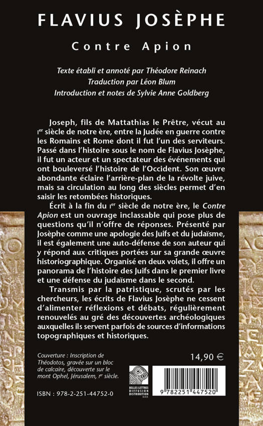 Joseph, fils de Mattathias le Prêtre, vécut au Ier siècle de notre ère, entre la Judée en guerre contre les Romains et Rome dont il fut l’un des serviteurs. Passé dans l’histoire sous le nom de Flavius Josèphe, il fut un acteur et un spectateur des événements qui ont bouleversé l’histoire de l’Occident. Son œuvre abondante éclaire l’arrière-plan de la révolte juive, mais sa circulation au long des siècles permet d’en saisir les retombées historiques. Écrit à la fin du Ier siècle de notre ère, le Contre Apion est un ouvrage inclassable qui pose plus de questions qu’il n’offre de réponses. Présenté par Josèphe comme une apologie des Juifs et du judaïsme, il est également une auto-défense de son auteur qui y répond aux critiques portées sur sa grande œuvre historiographique. Organisé en deux volets, il offre un panorama de l’histoire des Juifs dans le premier livre et une défense du judaïsme dans le second. Transmis par la patristique, scrutés par les chercheurs, les écrits de Flavius Josèphe ne cessent d’alimenter réflexions et débats, régulièrement renouvelés au gré des découvertes archéologiques auxquelles ils servent parfois de sources d’informations topographiques et historiques.