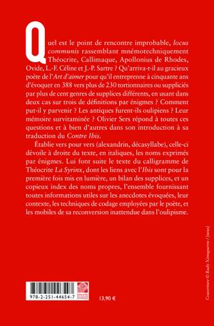 Quel est le point de rencontre improbable, locus communis rassemblant mnemotechniquement Theocrite, Callimaque, Apollonius de Rhodes, Ovide, L.-F. Celine et J.-P. Sartre ? Qu'arriva-t-il au gracieux poete de l'Art d'aimer pour qu'il entreprenne a cinquante ans d'evoquer en 388 vers plus de 230 tortionnaires ou supplicies par plus de cent genres de supplices differents, en usant dans deux cas sur trois de definitions par enigmes ? Comment put-il y parvenir ? Les antiques furent-ils oulipiens ? Leur memoire survitaminee ? Olivier Sers repond a toutes ces questions et a bien d'autres dans son introduction a sa traduction du Contre Ibis. Etablie vers pour vers (alexandrin, decasyllabe), celle-ci devoile a droite du texte, en italiques, les noms exprimes par enigmes. Lui font suite le texte du calligramme de Theocrite La Syrinx, dont les liens avec l'Ibis sont pour la premiere fois mis en lumiere, un bilan des supplices, et un copieux index des noms propres, l'ensemble fournissant toutes informations utiles sur les anecdotes evoquees, leur contexte, les techniques de codage employees par le poete, et les mobiles de sa reconversion inattendue dans l'oulipisme.