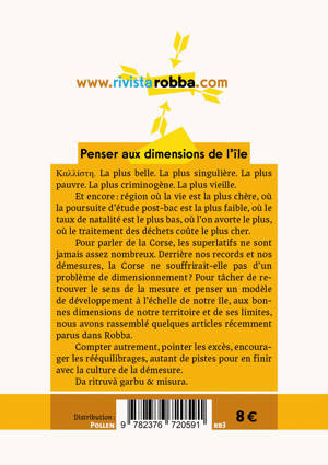 La plus belle. La plus singulière. La plus pauvre. La plus criminogène. La plus vieille.Et encore : région où la vie est la plus chère, où la poursuite d’étude post-bac est la plus faible, où le taux de natalité est le plus bas, où l’on avorte le plus, où le traitement des déchets coûte le plus cher.Pour parler de la Corse, les superlatifs ne sont jamais assez nombreux. Derrière nos records et nos démesures, la Corse ne souffrirait-elle pas d’un problème de dimensionnement ? Pour tâcher de retrouver le sens de la mesure et penser un modèle de développement à l’échelle de notre île, aux bonnes dimensions de notre territoire et de ses limites, nous avons rassemblé quelques articles récemment parus dans Robba.Compter autrement, pointer les excès, encourager les rééquilibrages, autant de pistes pour en finir avec la culture de la démesure.Da ritruvà garbu & misura.