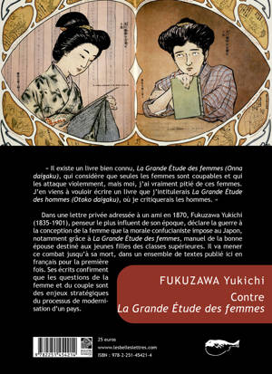 Il existe un livre bien connu, La Grande Etude des femmes (Onna daigaku), qui considere que seules les femmes sont coupables et qui les attaque violemment, mais moi, j'ai vraiment pitie de ces femmes. J'en viens a vouloir ecrire un livre que j'intitulerais La Grande Etude des hommes (Otoko daigaku), ou je critiquerais les hommes. Dans une lettre privee adressee a un ami en 1870, Fukuzawa Yukichi (1835-1901), penseur le plus influent de son epoque, declare la guerre a la conception de la femme que la morale confucianiste impose au Japon, notamment grace a La Grande Etude des femmes, manuel de la bonne epouse destine aux jeunes filles des classes superieures. Il va mener ce combat jusqu'a sa mort, dans un ensemble de textes publie ici en francais pour la premiere fois. Ses ecrits confirment que les questions de la femme et du couple sont des enjeux strategiques du processus de modernisation d'un pays.