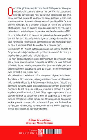 On credite generalement Beccaria d'avoir ete le premier a imaginer un requisitoire contre la peine de mort, en 1764. Il a pourtant ete precede par Giuseppe Pelli, auteur d'un essai redige des 1760. Laisse inacheve, puis reste inedit par prudence politique, le manuscrit a recemment ete decouvert a Florence et enfin publie en 2014. Ce texte pionnier temoigne de la diffusion precoce en Italie d'une sensibilite abolitionniste: c'est en Toscane, dans la patrie meme de Pelli, que la peine de mort est abolie pour la premiere fois dans le monde, en 1786. Le texte italien traduit en francais est precede de la correspondance entre G. Pelli et C. Beccaria, sous le signe du partage du sensible: les deux hommes se reconnaissent comme unis par une meme aspiration du cur a un monde libere du scandale de la peine de mort. L'introduction de Philippe Audegean propose une analyse savante de l'argumentation du juriste florentin, qui demontre avant C. Beccaria que la peine de mort est inutile, nuisible, injuste: La mort est non seulement inutile comme moyen de prevention, mais elle se revele en outre nuisible, puisqu'elle ote a l'Etat une force de travail. En vertu du pacte social, une peine n'est juste que si elle peut avoir ete prealablement acceptee par celui qui la subit; or, personne ne peut avoir consenti a etre puni de mort. La peine de mort est de surcroit la marque des regimes autoritaires. Au-dela de la decouverte des trois arguments du discours abolitionniste, la force de la critique de G. Pelli, son noyau insecable, est l'appel a une commune humanite. Juges et condamnes appartiennent a une meme humanite. Tel est ce qui interdit aux premiers le recours a la peine supreme, exorbitante selon G. Pelli. Si les juges se permettent, sous couvert de l'Etat, de condamner a mort les coupables de crime, c'est qu'ils se considerent, a tort, comme des etres superieurs, d'une autre espece que celles ou ceux qu'ils condamnent. Or, par cette illusion meme, ils s'avouent humains, trop humains, en ce qu'ils s'averent capables, a travers cette illusion, de tuer l'autre homme.