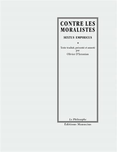 Pour Sextus Empiricus, médecin se réclamant de la voie sceptique inaugurée par Pyrrhon d'Elis, le dogmatisme moral est non seulement futile, mais encore dangereux. Parce que le trouble vient de ce que l'on cherche à obtenir des biens ou à éviter des maux que l'on croit réels, il est impératif de suspendre son jugement quant à leur nature et même leur existence. Ce n'est qu'une fois opéré ce dessaisissement de la raison par elle-même, dans ses prétentions théoriques et pratiques, que pourront advenir, comme par inadvertance, la sérénité et la tranquillité de l'âme. En développant le projet, des Esquisses pyrrhoniennes, le Contre les moralistes met en oeuvre tous les moyens pour obtenir de son lecteur un renoncement véritable, afin que ce dernier ne s'accorde qu'à la loi des événements, et vive au bonheur de leur simple manifestation.