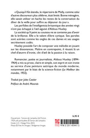 Quoiqu'il fut etendu, le repertoire de Molly, comme celui d'autres discoureurs plus celebres, etait limite. Bonne menagere, elle savait utiliser en hachis les restes de la conversation du diner de la veille pour suffire au dejeuner du jour . Les perfidies de l'intelligentsia britannique des annees vingt n'ont pas echappe a l'oeil aiguise d'Aldous Huxley. La societe qu'il peint au couteau ne se contente pas d'avoir de la brillance. Elle a le talent d'etre cynique. Ses paroles sont acerees comme les ongles de ces dames et ses usages secretement codes. Huxley possede l'art de composer une melodie en jouant sur les dissonances. Maitre en contrepoint, il reussit la un chef-d'oeuvre d'ironie, clin d'oeil de la passion a la raison.