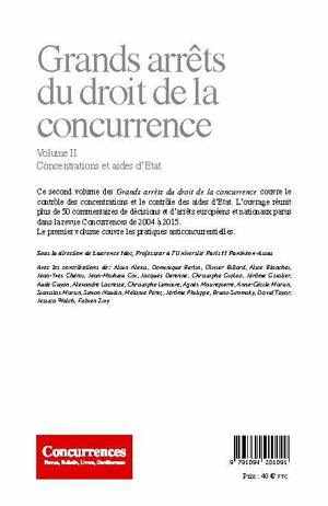 Ce second volume des Grands arrêts du droit de la concurrence couvre le contrôle des concentrations et le contrôle des aides d'Etat. L'ouvrage réunit plus de 50 commentaires de décisions et d'arrêts européens et nationaux parus dans la revue Concurrences de 2004 à 2015. Le premier volume couvre les pratiques anticoncurrentielles.