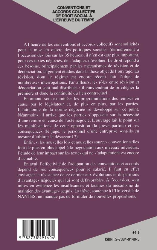 À l'heure où les conventions et accords collectifs sont sollicités pour la mise en uvre des politiques sociales, il n'en est que plus important pour ces textes négociés de s'adapter et d'évoluer. Le droit répond à ces besoins par des mécanismes de révision et dénonciation qui sont largement étudiés dans cet ouvrage.