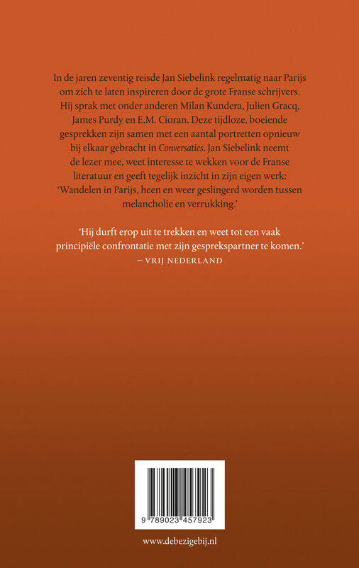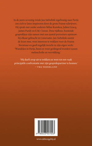In de jaren zeventig reisde Jan Siebelink regelmatig naar Parijs om zich te laten inspireren door de grote Franse schrijvers. Hij sprak met onder anderen Milan Kundera, Julien Gracq, James Purdy en E.M. Cioran. Deze tijdloze, boeiende gesprekken zijn samen met een aantal portretten opnieuw bij elkaar gebracht in Conversaties. Jan Siebelink neemt de lezer mee, weet interesse te wekken voor de Franse literatuur en geeft tegelijk inzicht in zijn eigen werk: ‘Wandelen in Parijs, heen en weer geslingerd worden tussen melancholie en verrukking.’