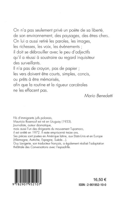 Fils d'immigrants polonais, Mauricio Rosencof est né en Uruguay (1933). Journaliste, auteur dramatique, mais aussi dirigeant du mouvement Tupamaro, il est arrêté en 1972. Il reste emprisonné treize ans. "En prison, son expérience d'écrivain lui sert. Il transforme ses visions en sujets d'une foule de poèmes brefs qu'il mémorise s'il n'a pas de quoi écrire. Cela donnera entre autres les cent quarante textes laconiques ressemblés ici sous un titre symbolique" (Ghislain Ripault, préfacier).