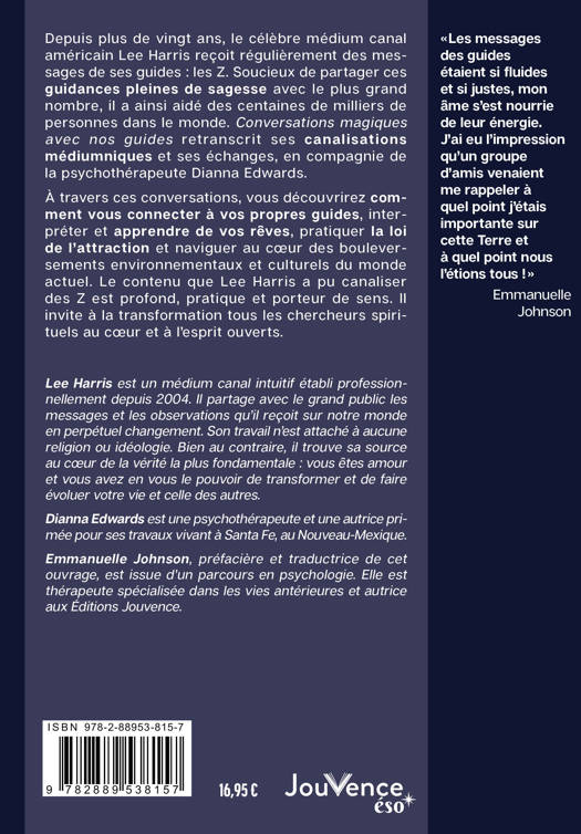 Depuis plus de vingt ans, le célèbre médium canal américain Lee Harris reçoit régulièrement des messages de ses guides : les Z. Soucieux de partager ces guidances pleines de sagesse avec le plus grand nombre, il a ainsi aidé des centaines de milliers de personnes dans le monde. Conversations magiques avec nos guides retranscrit ses canalisations médiumniques et ses échanges, en compagnie de la psychothérapeute Dianna Edwards.
