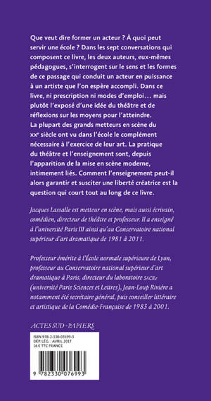 La formation d'un acteur n'est pas un simple apprentissage de techniques, car l'art de l'acteur n'est pas réductible à un savoir-faire. Que veut dire alors former un acteur ? A quoi peut servir une école ? Dans les sept conversations qui composent ce livre, les deux auteurs, eux-mêmes pédagogues, s'interrogent sur le sens et les formes de ce passage qui conduit un acteur en puissance à un artiste que l'on espère accompli. Dans ce livre, ni prescriptions, ni modes d'emploi... mais plutôt l'exposé d'une idée du théâtre, et de réflexions sur les moyens pour l'atteindre. La plupart des grands metteurs en scène du XXe siècle ont vu dans l'école le complément nécessaire à l'exercice de leur art. La pratique du théâtre et l'enseignement sont, depuis l'apparition de la mise en scène moderne, intimement liés. Comment l'enseignement peut-il alors garantir et susciter une liberté créatrice est peut-être la question qui court tout au long de ce livre.