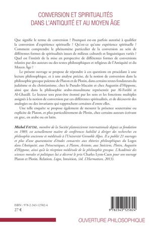 Comment comprendre le phénomène particulier de la conversion au sein de différentes formes de spiritualités issues de milieux culturels et linguistiques variés ? Le présent ouvrage procède à une lecture philosophique et à une analyse précise de la notion de conversion dans la philosophie grecque païenne de Platon et de Plotin, dans certains textes fondateurs du judaïsme et du christianisme, chez le Pseudo-Macaire et chez Augustin d'Hippone, ainsi que dans la philosophie arabo-musulmane représentée par Al-Farâbî et Al-Ghazâlî.
