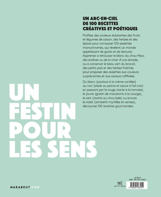 Profitez des couleurs éclatantes des fruits et légumes de saison, des herbes et des épices pour composer 100 assiettes monochromes, qui révèlent un monde appétissant de goûts et de textures. Apprenez à rehausser le blanc du chou-fleur, des endives ou de la chair d’une dorade, ou à conserver le beau vert du brocoli, des petits pois et des herbes fraîches pour proposer des assiettes aux couleurs surprenantes et aux saveurs raffinées. Du blanc (pavlova à la crème vanillée) au noir (steak au poivre et sauce à l’ail noir) en passant par le rouge (tarte à la tomate), le jaune (gratin de macaronis à la courge), le vert (risotto au chou kale) ou encore le violet (amaretti myrtilles et cerises), découvrez 100 recettes gourmandes. Un festin pour les sens !