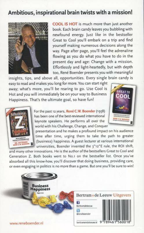 Ambitious, inspirational brain twists with a mission! Cool is Hot is much more than just another book. Each brain candy leaves you bubbling with newfound energy. Just like in the bestseller Great to Cool you'll embark on a trip and find yourself making numerous decisions along the way. Page after page, you'll feel the adrenaline flowing as you do what you have to do in the present day and age. Change with a mission. Effortlessly and light-heartedly, but with depth too, René Boender presents you with meaningful insights, tips, and above all, opportunities. Every single brain candy is easy to read and makes you long for more. You can start right away; what's more, you'll be rearing to go. Use Cool is Hot and you will immediately be on your way to Business Happiness. That's the ultimate goal, so have fun!
