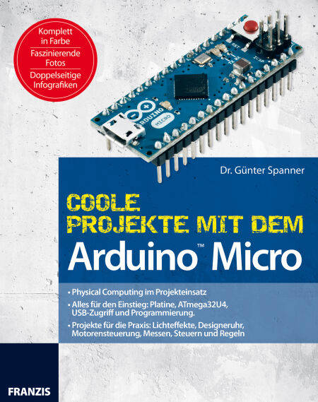 Unterschätzte Platine: Der Arduino™ Micro passt auf jedes Steck-board, steht aber in Sachen Leistung seinen großen Brüdern in nichts nach. Programmierneulinge werden die benutzerfreundliche Arduino™-Oberfläche lieben, Elektronik-Fans werden begeistert sein von den zahlreichen Projekten, die sie mit dem Micro umsetzen können. Kompaktes Elektronikwissen Raspberry Pi ist in aller Munde, aber für viele Projekte ist ein Arduino™ die bessere, weil stromsparende Alternative. Haben Sie schon einmal eine Designeruhr gebaut? Oder einen modernen Teeautomaten? All das ist mit dem Micro kein Problem. Auch für das Büro ist der Micro eine Bereicherung: Lassen Sie sich Daten direkt in Excel oder Word ausgeben oder nutzen Sie den Micro als Computermaus. Praxisprojekte Von Anfang an ist der Bezug zur Praxis da: Lassen Sie es blitzen mit dem Powerstroboskop, bauen Sie den LED-Würfel oder Ihre eigene Wetterstation. Der Autor, Dr. Günter Spanner, baut alle seine Projekte selbst und beweist das zum Beispiel auch in Webinaren zum Thema Arduino™.