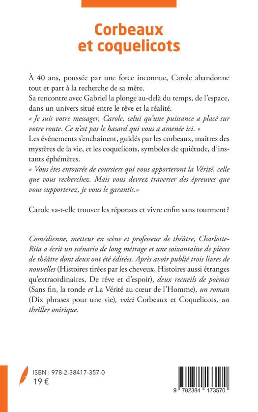 À 40 ans, poussée par une force inconnue, Carole abandonne tout et part à la recherche de sa mère. Sa rencontre avec Gabriel la plonge au-delà du temps, de l'espace, dans un univers situé entre le rêve et la réalité. « Je suis votre messager, Carole, celui qu'une puissance a placé sur votre route. Ce n'est pas le hasard qui vous a amenée ici. » Les événements s'enchaînent, guidés par les corbeaux, maîtres des mystères de la vie, et les coquelicots, symboles de quiétude, d'instants éphémères. « Vous êtes entourée de coursiers qui vous apporteront la Vérité, celle que vous recherchez. Mais vous devrez traverser des épreuves que vous supporterez, je vous le garantis.» Carole va-t-elle trouver les réponses et vivre enfin sans tourment ?