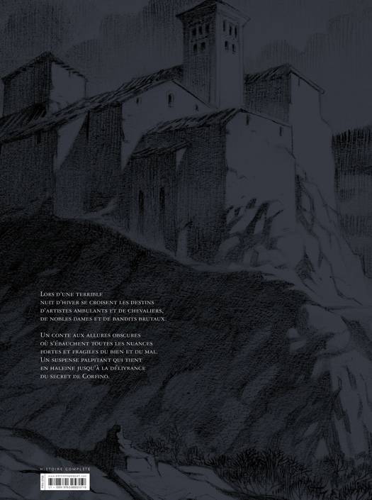 Lors d'une terrible nuit d'hiver se croisent les destins d'artistes ambulants et de chevaliers, de nobles dames et de bandits brutaux. Un conte aux allures obscures où s'ébauchent toutes les nuances fortes et fragiles du bien et du mal. Un suspense palpitant qui tient en haleine jusqu'à la délivrance du secret de Corfino.